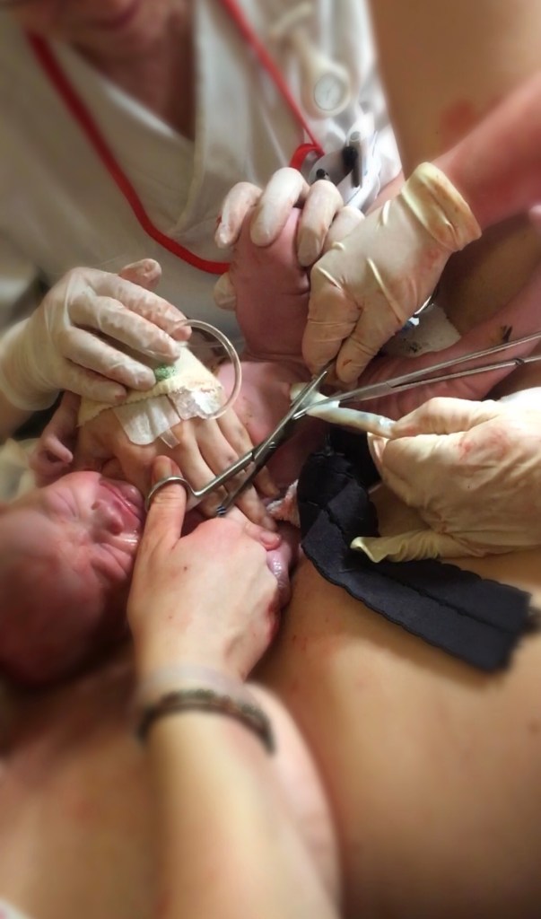 Zhruba za dvacet minut je pupečník připraven k přestřižení. Tove se ptá Chytrolína, jestli to chce udělat on. Ten ale s díky odmítá. Jordmor si tedy začne chystat nůžky a mně to nedá: „A mohla bych teda stříhat já, když ne on?“ Tove se začne smát a předává mi nůžky. Erna přidržuje Chobotničku, Tove zapeánuje pupečník a drží ho připravený pro střihnutí. Chytrolín to celé natáčí. Šmik a najednou je z ní samostatná jednotka, už nejsme napevno spojené. Chvíli na to hladce odchází placenta, ale příjemné to teda není. V hlavě mi vytane věta, kterou jsem tak často použila, když jsem stála na té druhé straně – naposledy zatlač a hrozně se uleví. A jo, ta úleva je hrozně příjemná. Oči mám jen pro Chobotničku. Až teď zpětně mě mrzí, že jsem se nepodívala na vlastní placentu. Nevnímala jsem nic kolem sebe. Můj svět byly v tu chvíli jen ty vykulené oči, co si mě se zájmem prohlížely. Nejeví zatím o prso žádný velký zájem a tak se jen navzájem hypnotizujeme.