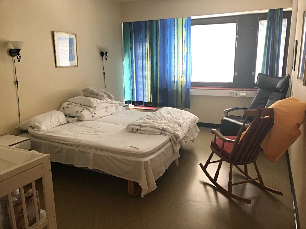 V šest ráno se tedy dostáváme na poporodní pokoj. Chce se mi doslova brečet z toho, jak je krásný. Obrovská manželská postel, velké okna, přebalovací pult s úplným vybavením – ručníky, oblečení pro mě a pro Chobotničku, perlan, plenky, žínky, vložky, olej, pletené dečky,… Prostě všechno co potřebujeme nebo bychom mohli potřebovat. Taky tam je jedno polohovací a jedno houpací křeslo. Kojící polštář, dva noční stolky a věšák. Přesouvám se do postele, podávají mi ten spící uzlíček a vykládají všechny věci. Chytrolín padá do postele a snad ještě než si lehne, začíná usínat. Já sedím na posteli a pozoruju ten drobný obličejík. Chytrolín mě vybízí, ať už jdu taky spát. Vůbec se mi nechce, ale zároveň cítím šílenou únavu. Dělám si fotku a píšu tátovi zprávu. Kolem půl sedmé pokládám Chobotničku doprostřed postele, lehám si k ní z druhé strany než spí Chytrolín a upadám do lehce komatózního stavu.