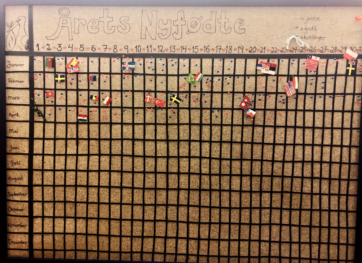 Přichází na scénu Akce autosedačka – my to doma trénovali, ale s tim miminem je to nakonec přeci jen takový jiný… Chytrolín tedy nakonec Majdu i s autosedačkou bere a jde poprosit jordmor, aby mu to zkontrolovala. Já se dooblíknu a jdu za nima. Ještě jeden důležitý úkol mám! Když šel Chytrolín po porodu Majdu zvážit, zastavila ho Erna u tabule, kam se dávají špendlíky za děti, které se ten který den narodily. Za kluky modré, za holčičky červené. Dvojčata mají špendlíky s mašličkou. A my tam okoukali, že nenorské děti mívají u špendlíku vlastnoručně vyrobenou vlaječku státu, ze kterého pochází. Chytrolín vyrobil tu naší českou a já jí tam šla slavnostně připíchnout k našemu špendlíku. Jordmor se s námi loučí, ujišťuje se, že s námi o porodu mluvila „naše“ jordmor a také lékařka a předala nám partogram. K tomu teď dostáváme všechny zbývající dokumenty – mojí těhotenskou kartu (hele, tohle vědět… vědět, že mi zůstane, tak sem si jí doma nemusela před cestou do porodnice ofocovat na památku… 😀 ), různé manuály a tabulky – skvělá věc! Třeba tabulka toho, jak vypadá stolice miminka, když je v pořádku a když ne, jak má často čůrat a nejčastější náznaky toho, že je něco špatně. A taky různá povídání, co nás může první dny doma potkat, kdy volat do nemocnice, kdy jet na pohotovost a všechna důležitá čísla. A několikero ujištění, že do porodnice můžeme kdykoliv přijet zpět, pokud si budeme myslet, že něco není v pořádku.