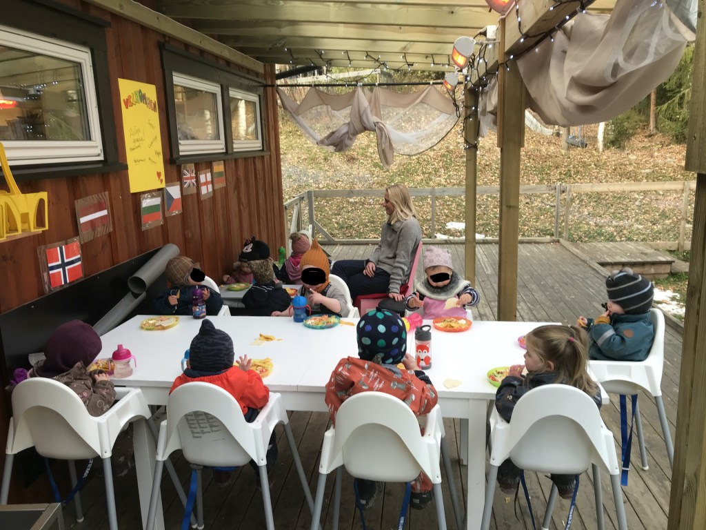 Hodně školek buď jídlo nevede a rodiče tak dávají dětem s sebou balíčky s jídlem (matpakke), nebo servírují pouze studenou kuchyni. To taky není v Norsku nic neobvyklého. Oběd tu nemá podobu české kuchyně ve stylu hovězího vývaru, následovaného svíčkovou se šesti. Noři si spíše dají jeden, dva krajíce chleba s máslem nebo majonézou a plátkem šunky, salát nebo jen polévku. Na české poměry, podle mě, Noři hrozně málo jí. 😀 My vybírali školku i podle kuchyně, a tak má Čudla veškerý servis tam. Od snídaně po (často teplý) oběd s bonusem ovocných/zeleninových svačin v mezičasech. Můžeme se snadno dohodnout, pokud si přejeme nějakou speciální úpravu jídelníčku. Jídlo mají většinou servírované venku na terase za každého počasí, což tedy neplatí poslední měsíc. To nám klesly teploty ke -20 stupňům a dětem mrzly tlapičky. 😀