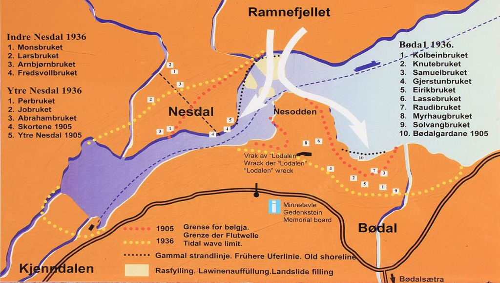 První sesuv půdy nastal pozdě večer 15. ledna 1905. Na úbočí Ramnefjellet (1779 m n. m.), se ve výšce 500 metrů utrhla část skály o velikosti 50 000 m³. Při pádu dala do pohybu dalších 300 000 kubíků štěrku a kamení, a vše skončilo na dně hlubokého jezera Lovatnet. Masa ale také vytvořila ohromnou přílivovou vlnu, vysokou přes 40 metrů, která se přes jezero hnala na malé vesnice Nesdal a Bødal. Vlna smetla nejen domy a hospodářská stavení, ale i les a parník Lodølen, který odhodila na pevninu, 300 metrů od břehu. Onoho večera tu celkem zemřelo 61 ze 122 lidí, žijících v těchto dvou vesnicích.